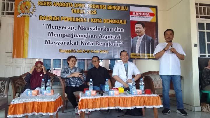 Bengkulu, — Dalam agenda reses masa sidang tahun 2025, Anggota DPRD Provinsi Bengkulu dari Partai Hanura, Usin Sembiring, menggelar pertemuan yang dihadiri perwakilan masyarakat dari seluruh kecamatan di Kota Bengkulu.